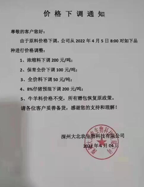 深州大北農(nóng)生物科技有限公司:4月5日起,濃縮料下調(diào)200元/噸,保育全價下調(diào)100元/噸,全價料下調(diào)50元/噸,8%仔豬預混下調(diào)200元/噸;