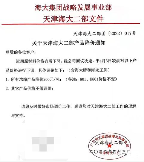 天津海大:4月3日起,所有濃縮產(chǎn)品降價200元/噸;