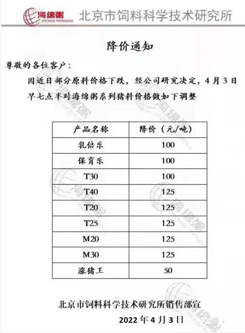 北京市飼料科學技術(shù)研究所:4月3日起,豬料下調(diào)50-125元/噸;