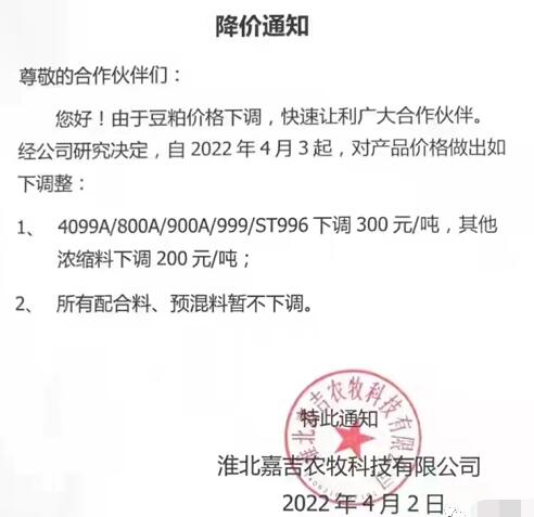 淮北嘉吉農(nóng)牧科技有限公司:4月3日起,4099A/800A/900A/999/ST996下調(diào)300元/噸,其他濃縮料下調(diào)200元/噸;