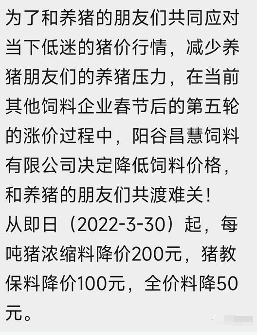 陽谷昌慧飼料有限公司:4月3日起,教保、全價精補料再度下調(diào)50元/噸,濃縮料下調(diào)200元/噸;此前3月30日時,該公司已將濃縮料降價200元/噸,教保料降價100元/噸,全價料降價50元/噸;