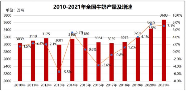 1、2021年全國牛奶產(chǎn)量3683萬噸