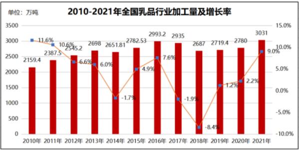 2、2021年全國乳制品加工量3031萬噸