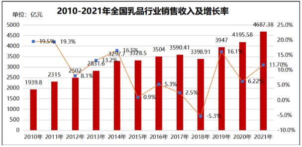 3、2021年全國乳制品銷售收入4687億元
