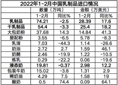 2022年1-2月我國共計進(jìn)口各類乳制品74.21萬噸,同比減少2.5%,進(jìn)口額28.39億美元,同比增長17.6%。其中,進(jìn)口干乳制品54.4萬噸,同比減少3.3%,進(jìn)口額25.4億美元,同比增長18.2%;進(jìn)口液態(tài)奶19.81萬噸,同比減少0.4%,進(jìn)口額2.98億美元,同比增長12.2%。從進(jìn)口的主要品類來看,大包粉、奶油、酸奶增長外,其余品類產(chǎn)品均有不同幅度的下降。