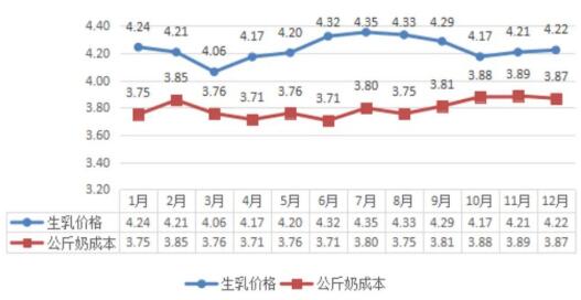 圖1 2021年黑龍江省月度生乳價格和公斤奶成本曲線圖