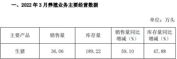 2022年1-3月,公司累計(jì)銷售生豬104.68萬(wàn)頭,銷售量同比增長(zhǎng)95.81%。