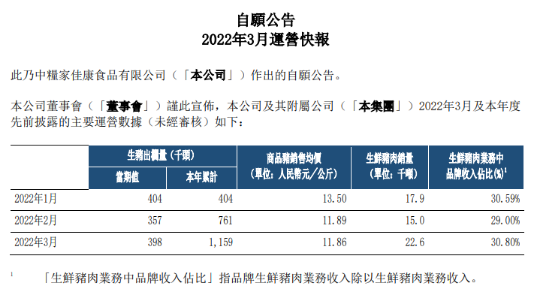 中糧家佳康4月12日公布2022年3月運(yùn)營(yíng)快報(bào)。公司3月生豬出欄量39.8萬(wàn)頭;商品豬銷售均價(jià)人民幣11.86元/公斤,生鮮豬肉銷量2.26萬(wàn)噸,生鮮豬肉業(yè)務(wù)中品牌收入占比為30.80%。