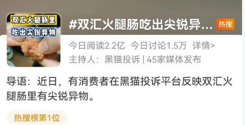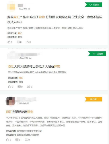 截至目前,記者在黑貓投訴平臺發(fā)現(xiàn),關(guān)于雙匯異物的投訴達到402條。