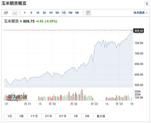 受此影響,糧食大宗商品價(jià)格再度大漲。美國(guó)時(shí)間周一,美國(guó)CBOT 7月玉米期貨大漲2.8%,突破每蒲式耳8美元,創(chuàng)2012年9月以來(lái)的近十年新高,較年初的6美元上漲1/3。