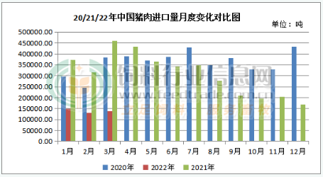 2022年3月份我國進口豬肉及雜碎總量為23萬噸,其中豬肉進口量為14萬噸,環(huán)比增長7.69%,同比繼續(xù)大幅下降,降幅達69.57%,3月份進口豬肉均價為12442元/噸,環(huán)比小幅下降30元/噸左右。雖然3月份豬價持續(xù)下跌,需求也進入階段性疲軟期,但3月份市場交易陸續(xù)恢復,進口量小幅增長屬于正常現(xiàn)象,目前豬肉進口也逐漸恢復到正常年份的進口量。