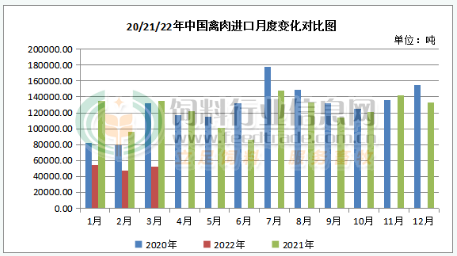 總體上3月份肉類進口較2月份有所恢復,但受新冠疫情影響,3月底4月初開始全球第一大集裝箱港口-上海港被封控,造成大量的貨船擁堵并擴大至附近的寧波、舟山。同時陸地運輸也受到阻礙,工廠倉庫關閉,大量貨物無法入境清關,冷藏箱貨物滯留船上。深圳地區(qū)港口也面臨同樣的壓力,貨運船只等待時間延長,部分港口堆場利用率達到90%,貨物運輸時間明顯拉長。另外,蛇口港宣布4月8日開始暫停冷凍肉類和海鮮產(chǎn)品進口,運輸受阻以及疫情防控等或對4月份肉類進口產(chǎn)生一定影響。