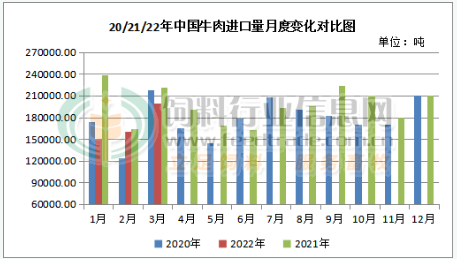 2022年3月份我國進口牛肉總量為20萬噸,環(huán)比增長25.00%,同比下降9.78%。3月份牛肉進口均價40905元/噸,環(huán)比上漲946元/噸??傮w上前三個月牛肉進口量呈現(xiàn)持續(xù)增長態(tài)勢,3月份牛肉進口量增長較為明顯,主要進口來源國依舊是巴西、阿根廷、烏拉圭等。