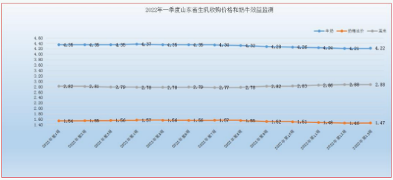 2、養(yǎng)殖收益:2022年第一季度我省奶價(jià)呈現(xiàn)高位回落態(tài)勢(shì),一季度我省生鮮乳平均交售價(jià)格為4.23元/公斤,環(huán)比降低1.63%,同比降低1.17%;按月度監(jiān)測(cè)來看,1-3月份我省生鮮乳平均交售價(jià)分別為4.32、4.26、4.12元/公斤。第一季度奶糧比價(jià)均值為1.51,環(huán)比降低1.31%,同比升高2.68%,一季度奶牛養(yǎng)殖收益低于去年四季度,但略高于去年同期。