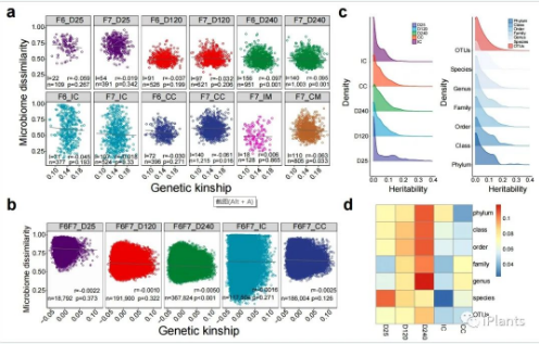 三、鑒別了影響不同階段及不同部位腸道菌群組成的宿主基因組變異位點:項目對兩個世代1430個嵌合個體進(jìn)行全基因組重測序,共鑒別到3000多萬個宿主基因組變異(即基因組上每100bp就有1個變異)?;谏鲜龈叨冗z傳變異的實驗群體,對檢測到的8490個細(xì)菌分類進(jìn)行了全基因組關(guān)聯(lián)分析,共檢測到1527個顯著影響846個細(xì)菌分類的豐度或存在與否的宿主基因組變異位點。