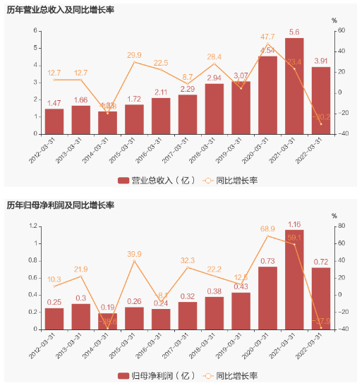 其中2022年第一季度,公司單季度主營收入3.91億元,同比下降30.2%;單季度歸母凈利潤7220.59萬元,同比下降37.94%;單季度扣非凈利潤5920.52萬元,同比下降39.01%;負債率22.36%,投資收益77.55萬元,財務費用213.76萬元,毛利率49.4%。