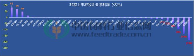 具體到農(nóng)林牧漁行業(yè),因為生豬養(yǎng)殖行業(yè)恰逢罕見的歷史低谷期,行業(yè)凈利潤同比去年下降130%,排名倒數(shù)第二,下跌幅度僅次于互聯(lián)網(wǎng)行業(yè)。飼料行業(yè)信息網(wǎng)梳理了農(nóng)林牧漁行業(yè)34家上市企業(yè),針對其營收、凈利潤、飼料銷量和生豬出欄量等指標(biāo)進(jìn)行了統(tǒng)計排名。