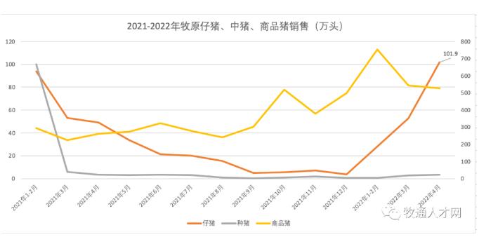 相比肥豬,仔豬行情明顯火熱起來:2022年4月,牧原銷售632萬頭生豬,其中種豬3.5萬頭,仔豬101.9萬頭,幾乎為2021年最高月。去年牧原的盈利主要就是靠一季度仔豬銷售獲得的。