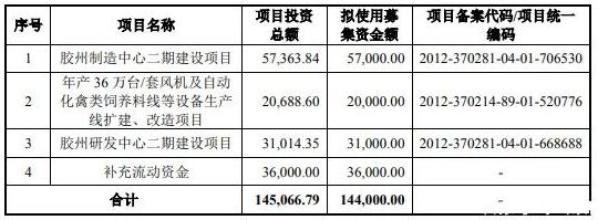 招股書顯示,大牧人擬在深交所主板公開發(fā)行新股5000萬股,占發(fā)行后總股本的25%,擬募集資金14.40億元,其中5.70億元用于“膠州制造中心二期建設(shè)項(xiàng)目”、2億元用于“年產(chǎn)36萬臺(tái)/套風(fēng)機(jī)及自動(dòng)化禽類飼養(yǎng)料線等設(shè)備生產(chǎn)線擴(kuò)建、改造項(xiàng)目”、3.10億元用于“膠州研發(fā)中心二期建設(shè)項(xiàng)目”、3.60億元用于“補(bǔ)充流動(dòng)資金”。