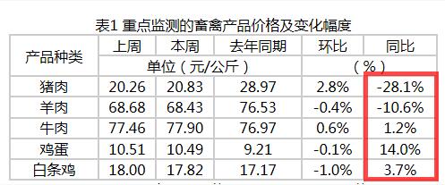 據(jù)農(nóng)業(yè)農(nóng)村部“全國農(nóng)產(chǎn)品批發(fā)市場價格信息系統(tǒng)“監(jiān)測,本周(2022年05月13日--2022年05月19日)重點監(jiān)測的畜禽產(chǎn)品豬肉、羊肉、牛肉、雞蛋和白條雞與上周相比,變化幅度在-1.0~2.8%之間(如下表所示)。