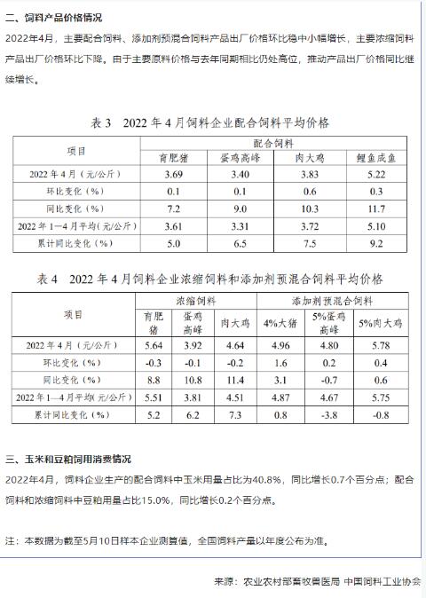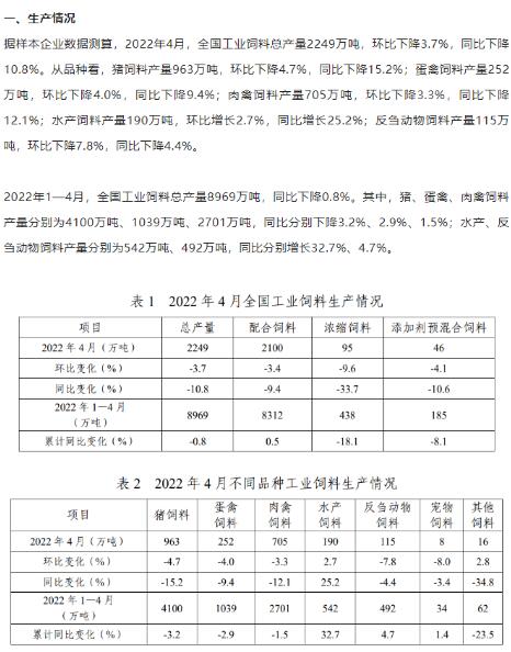 2022年1—4月,全國工業(yè)飼料總產(chǎn)量8969萬噸,同比下降0.8%。其中,豬、蛋禽、肉禽飼料產(chǎn)量分別為4100萬噸、1039萬噸、2701萬噸,同比分別下降3.2%、2.9%、1.5%。