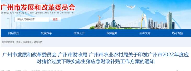 豬價過度下跌情形,指廣州市生豬出場價格豬糧比價(以廣州市價格監(jiān)測和成本調(diào)查中心的監(jiān)測數(shù)據(jù)為準(zhǔn))連續(xù)3周處于6:1以下,或者省發(fā)展改革委網(wǎng)站發(fā)布了過度下跌二級(一級)預(yù)警情形,或者廣州市發(fā)布過度下跌二級(一級)預(yù)警情形,經(jīng)市發(fā)展改革委會市農(nóng)業(yè)農(nóng)村局、財政局研判認定達到的價格異常波動的價格過度下跌之情形。