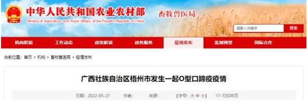 農(nóng)業(yè)農(nóng)村部網(wǎng)站5月27日消息,農(nóng)業(yè)農(nóng)村部接到中國(guó)動(dòng)物疫病預(yù)防控制中心報(bào)告,經(jīng)廣西壯族自治區(qū)動(dòng)物疫病預(yù)防控制中心確診,梧州市長(zhǎng)洲區(qū)一屠宰場(chǎng)發(fā)生O型口蹄疫疫情,同群生豬454頭,發(fā)病21頭。發(fā)現(xiàn)疫情后,當(dāng)?shù)亓⒓窗凑沼嘘P(guān)預(yù)案和防治技術(shù)規(guī)范要求做好疫情處置工作。