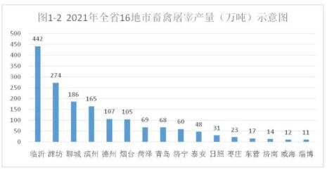 根據(jù)山東省畜牧獸醫(yī)局發(fā)布的《2021年山東省畜禽屠宰行業(yè)形勢發(fā)展報告》,2021年山東省屠宰產(chǎn)量前6名的地市分別是臨沂、濰坊、聊城、濱州、德州、煙臺,屠宰量分別占全省屠宰量的27.10%、16.77%、11.39%、10.13%、6.57%、6.45%,6市年屠宰量均超過100萬噸,合計1279.96萬噸,占全省屠宰量的78.41%。