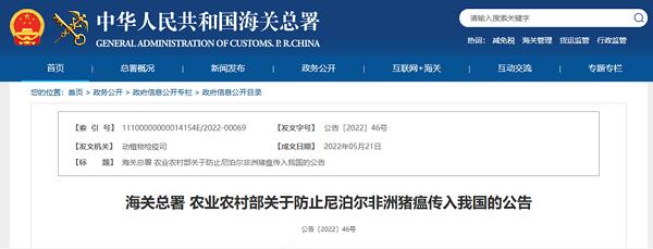 據(jù)海關(guān)總署網(wǎng)站5月31日消息,海關(guān)總署、農(nóng)業(yè)農(nóng)村部日前發(fā)布關(guān)于防止尼泊爾非洲豬瘟傳入我國的公告稱,2022年5月18日,尼泊爾向世界動物衛(wèi)生組織(OIE)緊急報告,3月19日至4月14日,該國巴格馬蒂?。˙agmati)6家農(nóng)場發(fā)生非洲豬瘟,涉及的易感動物有1426頭家豬,其中1364頭發(fā)病,934頭死亡。5月19日,世界動物衛(wèi)生組織(OIE)已確認尼泊爾出現(xiàn)首例非洲豬瘟,并成為第16個發(fā)生非洲豬瘟疫情的亞洲國家。