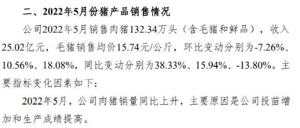 牧原股份公告稱,2022年5月份,公司銷售生豬586.3萬頭(其中仔豬銷售128.0萬頭),銷售收入84.09億元。其中向全資子公司牧原肉食品有限公司及其子公司合計(jì)銷售生豬52.19萬頭。2022年5月份,公司商品豬價(jià)格呈現(xiàn)震蕩上升趨勢(shì),商品豬銷售均價(jià)14.87元/公斤,比2022年4月份上升18.39%。
