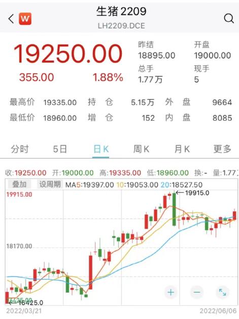 從豬期貨來看,自4月中旬開始,便開啟上漲行情,并在5月份漲至階段新高。截至目前,生豬期貨報(bào)19250元/噸,單日上漲1.88%,已經(jīng)連漲5天。