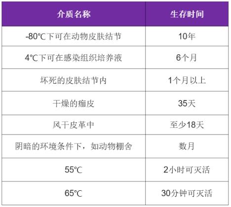 環(huán)境溫度越低病毒越穩(wěn)定。比如在壞死的皮膚結(jié)節(jié)內(nèi)可存活1個月以上,干燥的痂皮存活35天,風(fēng)干皮革中存活18天,陰暗潮濕的環(huán)境中可能保存15個月,55℃,2小時可滅活,65℃,30分鐘可滅活,對強酸和強堿環(huán)境都很敏感,對陽光和含脂溶劑的去污劑也敏感。另外,易被醚(20%)、氯仿、福爾馬林(1%)和十二烷基磺酸鈉等清潔劑滅活;易被苯酚(2%,15分鐘)、次氯酸鈉(2%~3%)、碘化合物(1:33稀釋)、季銨鹽(0.5%)滅活;雖然許多消毒劑能夠殺滅該病毒,但消毒劑往往難以殺滅發(fā)病動物脫落的痘疹痂皮中的病毒。