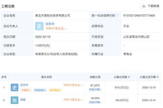 查詢得知,青島天普陽光投資有限公司法定代表人為史效華,占公司81%的股份。