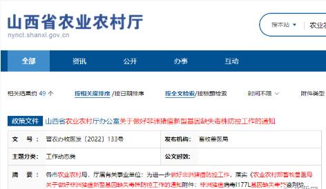 通知表示要落實(shí)《農(nóng)業(yè)農(nóng)村部畜牧獸醫(yī)局關(guān)于做好非洲豬瘟新型基因缺失毒株防控工作的通知》(農(nóng)牧便函〔2022〕438號(hào))要求,防范非洲豬瘟國(guó)外I177L基因缺失疫苗(以下簡(jiǎn)稱(chēng)“基因缺失疫苗”)流入山西省。