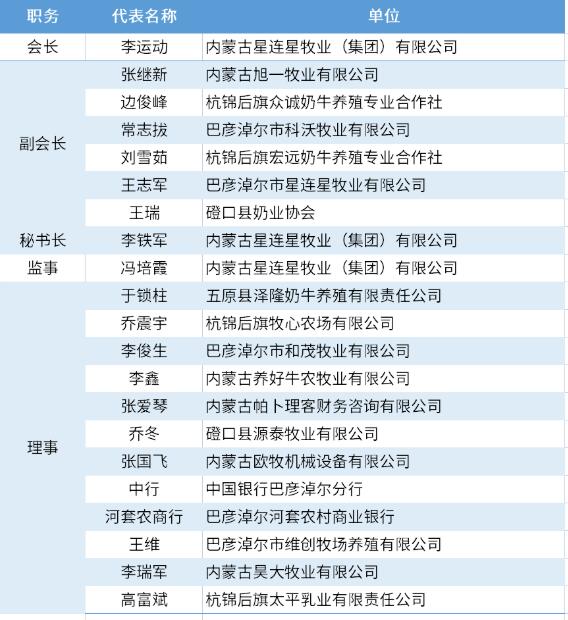 本次會(huì)議選舉產(chǎn)生了以李運(yùn)動(dòng)為會(huì)長(zhǎng),邊俊峰、常志拔、劉雪茹、王瑞、王志軍、張繼新為副會(huì)長(zhǎng),李鐵軍為秘書(shū)長(zhǎng),馮培霞為監(jiān)事長(zhǎng),于鎖柱、喬震宇、李俊生、李鑫、張愛(ài)琴、喬冬、張國(guó)飛、王維、李瑞軍、高富斌、中國(guó)銀行巴彥淖爾分行、巴彥淖爾河套農(nóng)村商業(yè)銀行為理事,并進(jìn)行了中國(guó)銀行、河套農(nóng)商行奶業(yè)扶持貸款政策宣講等。