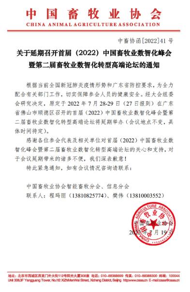 根據(jù)當(dāng)前全國新冠肺炎疫情形勢和廣東省防控要求,為全力配合有關(guān)部門工作,切實(shí)保障參會(huì)人員的健康安全。經(jīng)大會(huì)組委會(huì)研究決定,原定于2022年7月28-29日(27日?qǐng)?bào)到)在廣東省佛山市順德區(qū)召開的首屆(2022)中國畜牧業(yè)數(shù)智化峰會(huì)暨第二屆畜牧業(yè)數(shù)智化轉(zhuǎn)型高端論壇將延期舉辦(會(huì)議地點(diǎn)不變,具體時(shí)間待定)。