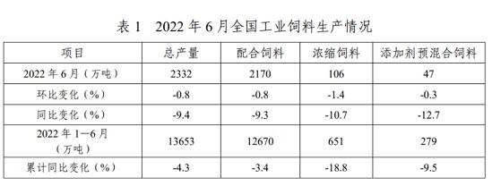 中國飼料工業(yè)協(xié)會最新數(shù)據(jù)顯示,2022年6月,全國工業(yè)飼料總產(chǎn)量2332萬噸,同比下降9.4%,其中豬飼料產(chǎn)量945萬噸,環(huán)比下降4.1%,同比下降12.4%。其他蛋禽飼料、肉禽飼料也處于同比下降的局面,僅水產(chǎn)飼料同比上漲11.8%。