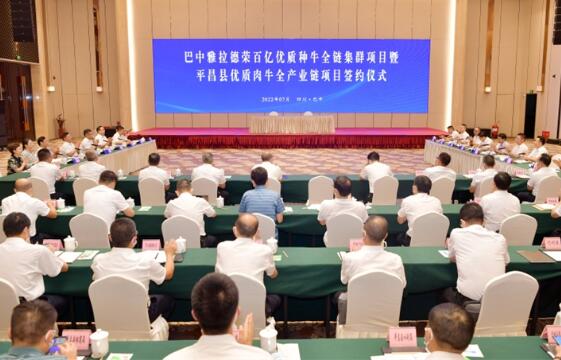 據(jù)悉,該項目總投資150億元左右,是由雅拉德榮(廣東)農(nóng)業(yè)投資有限公司通過引進國外優(yōu)質(zhì)青年母牛,在巴中市境內(nèi)開展肉牛品種選育、擴繁、育肥、屠宰加工及銷售,帶動當?shù)仞B(yǎng)殖場戶共同發(fā)展肉牛產(chǎn)業(yè),并配套開展飼料生產(chǎn)、有機肥加工等業(yè)務。項目內(nèi)容包括建設1個肉牛核心育種場、4個擴繁場、約20個肉牛育肥場,建設飼料廠、現(xiàn)代化肉牛屠宰場加工廠、冷鏈物流配送中心、有機肥加工廠和肉牛養(yǎng)殖數(shù)字化服務平臺,肉牛研究院等。通過分期分年帶動實施,爭取項目滿產(chǎn)在巴中全市范圍內(nèi)達到存欄優(yōu)質(zhì)能繁母牛30萬頭,年出欄優(yōu)質(zhì)肉牛10萬頭。