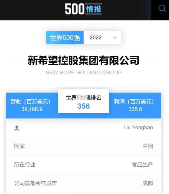 新希望控股集團去年首次進入《財富》世界500強榜單,取得了390位的好名次,可以說是風光無限。
