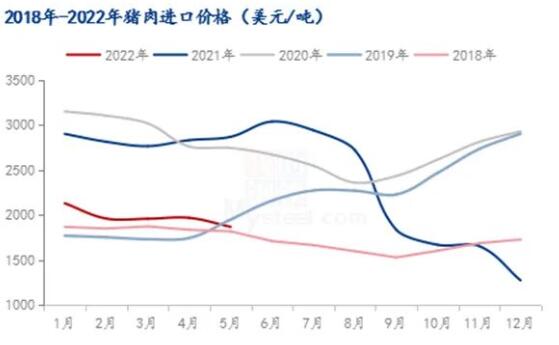 海關最新數(shù)據(jù)顯示,2022年5月中國豬肉進口13萬噸,環(huán)比下跌7.14%,同比下跌64.86%。2022年1至5月,中國累計進口豬肉68萬噸,同比減少65.2%。