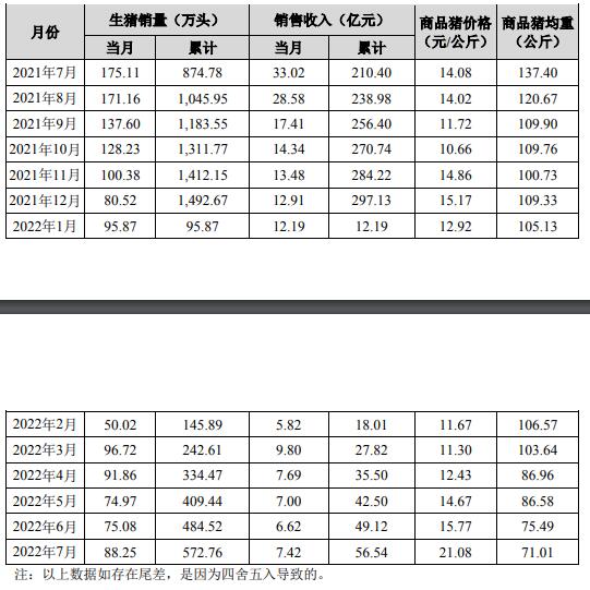 2022年1-7月,公司累計銷售生豬572.76萬頭,同比下降34.52%;累計銷售收入56.54億元,同比下降73.13%。