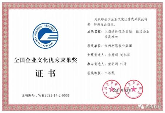 年初,中國企業(yè)聯(lián)合會、中國企業(yè)家協(xié)會發(fā)布了《關(guān)于表彰2020-2021年度全國企業(yè)文化優(yōu)秀成果的決定》??露骷瘓F選送的企業(yè)文化建設(shè)成果《以創(chuàng)造價值為引領(lǐng),推動企業(yè)提質(zhì)增效》,榮獲全國企業(yè)文化優(yōu)秀成果二等獎,并于近日收到了獲獎證書。這也是柯恩繼繼續(xù)2019年榮獲第二十六屆二等全國企業(yè)管理現(xiàn)代化創(chuàng)新成果之后獲得的又一國家級獎項。