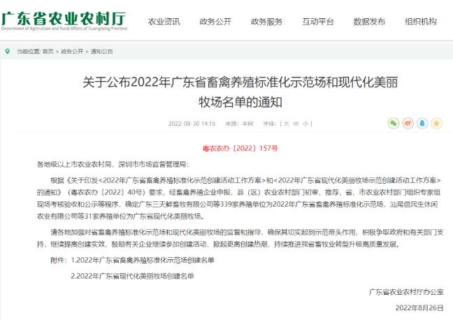 2022年8月30日,廣東省農(nóng)業(yè)農(nóng)村廳發(fā)布《關(guān)于公布2022年廣東省畜禽養(yǎng)殖標(biāo)準(zhǔn)化示范場和現(xiàn)代化美麗牧場名單的通知》。金新農(nóng)旗下廣州天種牧業(yè)有限公司、韶關(guān)市優(yōu)佰特畜牧科技有限公司、韶關(guān)金新農(nóng)畜牧養(yǎng)殖有限公司等3家生豬養(yǎng)殖企業(yè)確定為2022年廣東省畜禽養(yǎng)殖標(biāo)準(zhǔn)化示范場,旗下韶關(guān)金新農(nóng)畜牧養(yǎng)殖有限公司、天種(韶關(guān)市)畜牧科技有限公司、廣州天種牧業(yè)有限公司等3家生豬養(yǎng)殖企業(yè)確定為2022年廣東省現(xiàn)代化美麗牧場。