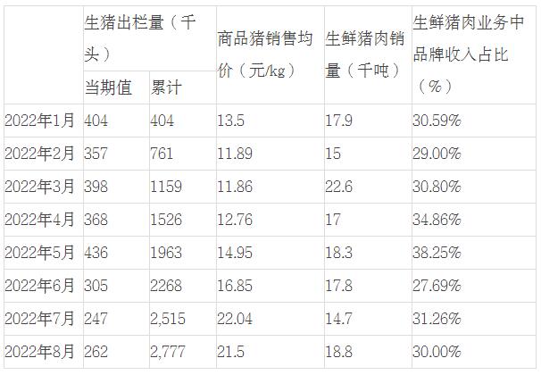 2022年1-8月,公司累計(jì)銷售生豬277.7萬頭。