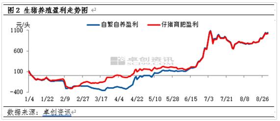 一季度生豬價(jià)格震蕩下跌,且飼料價(jià)格逐漸上漲,養(yǎng)殖虧損逐漸加重,多數(shù)時(shí)間內(nèi)自繁自養(yǎng)與仔豬育肥均處于虧損狀態(tài)。隨著二季度生豬供應(yīng)縮緊,豬價(jià)出現(xiàn)上漲趨勢(shì),虧損狀態(tài)下的養(yǎng)殖端多壓欄惜售,進(jìn)一步導(dǎo)致生豬供應(yīng)的下降幅度,從而支撐生豬價(jià)格漲幅逐漸擴(kuò)大。伴隨生豬價(jià)格上漲,5月份自繁自養(yǎng)與仔豬育肥均回歸至盈利狀態(tài)。6月份豬價(jià)漲幅擴(kuò)大,7月初自繁自養(yǎng)盈利、仔豬育肥盈利均突破“千元”大關(guān),后期生豬價(jià)格雖有回落但幅度有限,且飼料價(jià)格下降,7-8月份生豬養(yǎng)殖盈利降后上漲。