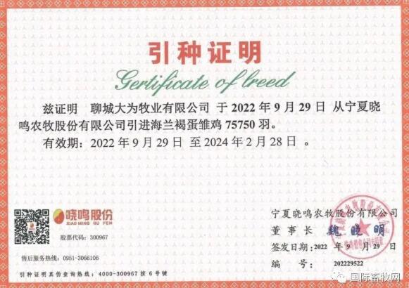 2022年9月29日,聊城大為牧業(yè)有限公司從寧夏曉鳴農(nóng)牧股份有限公司引進(jìn)的75000套海蘭褐 817種雞順利抵達(dá)大為牧業(yè)雙龍種雞場,為公司的發(fā)展提供強(qiáng)有力的種源支撐。