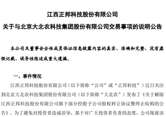 公告稱,正邦科技于3月1日收到大北農(nóng)預(yù)付款5億元,并已按照交易約定的先決條件履行并達(dá)成自身責(zé)任義務(wù),履約過程積極配合以促進(jìn)交易順利進(jìn)行。大北農(nóng)9月30日發(fā)布終止收購(gòu)公告,單方面解除與正邦科技合作?!敖?jīng)核查,該公告部分內(nèi)容與事實(shí)不符,公司目前暫未收到法院通知。對(duì)于大北農(nóng)公告中有損公司聲譽(yù)的不當(dāng)陳述,公司將保留進(jìn)一步追究法律責(zé)任的權(quán)利。