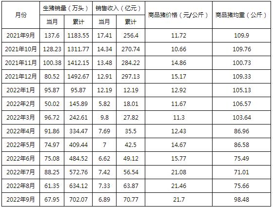 2022年1-9月,公司累計銷售生豬702.07萬頭,同比下降40.68%;累計銷售收入70.77億元,同比下降72.40%。