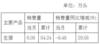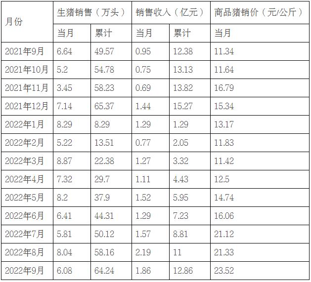 2022年1-9月,公司共銷(xiāo)售生豬64.24萬(wàn)頭(其中商品豬61.21萬(wàn)頭),銷(xiāo)售收入12.86億元。其中向集團(tuán)內(nèi)部屠宰企業(yè)銷(xiāo)售生豬11.96萬(wàn)頭。