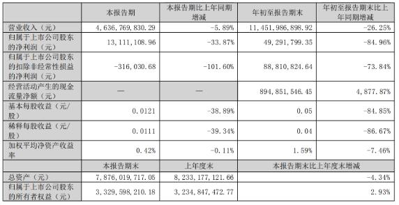 前三季度營收約114.52億元,同比減少26.25%;歸屬于上市公司股東的凈利潤約4929萬元,同比降84.96%。